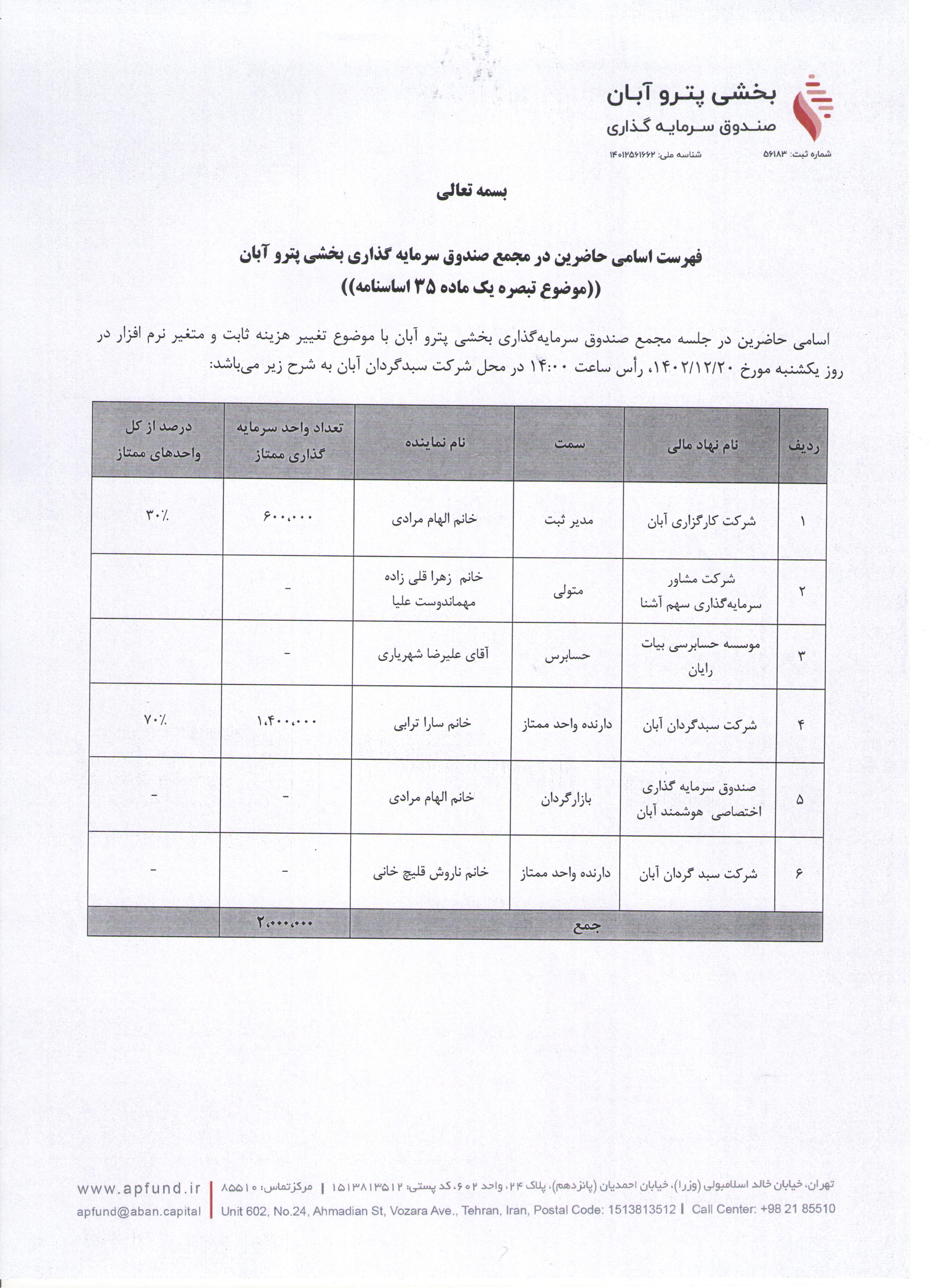 اسامی حاضرین در مجمع صندوق سرمایه گذاری بخشی پترو آبان با موضوع تغییر هزینه ثابت و متغیر نرم افزار مورخ ۱۴۰۲/۱۲/۲۰