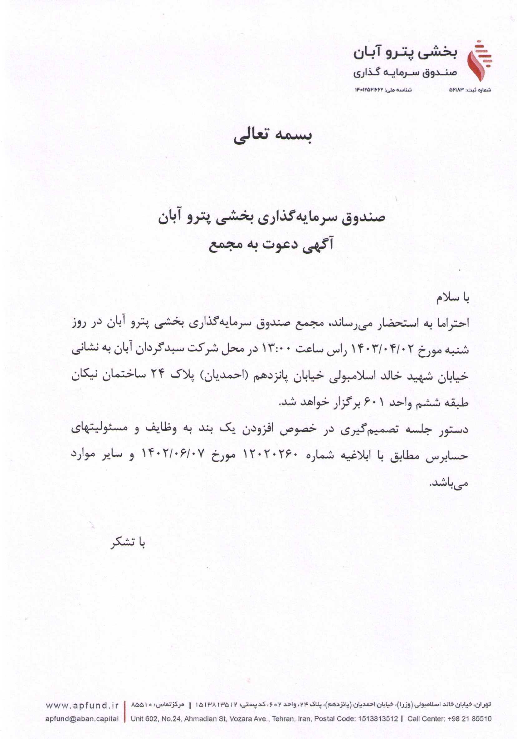 اگهی دعوت به مجمع مورخ ۱۴۰۳/۰۴/۰۲ صندوق بخشی پترو آبان با موضوع افزودن یک بند به مسئولیتها و وظایف حسابرس