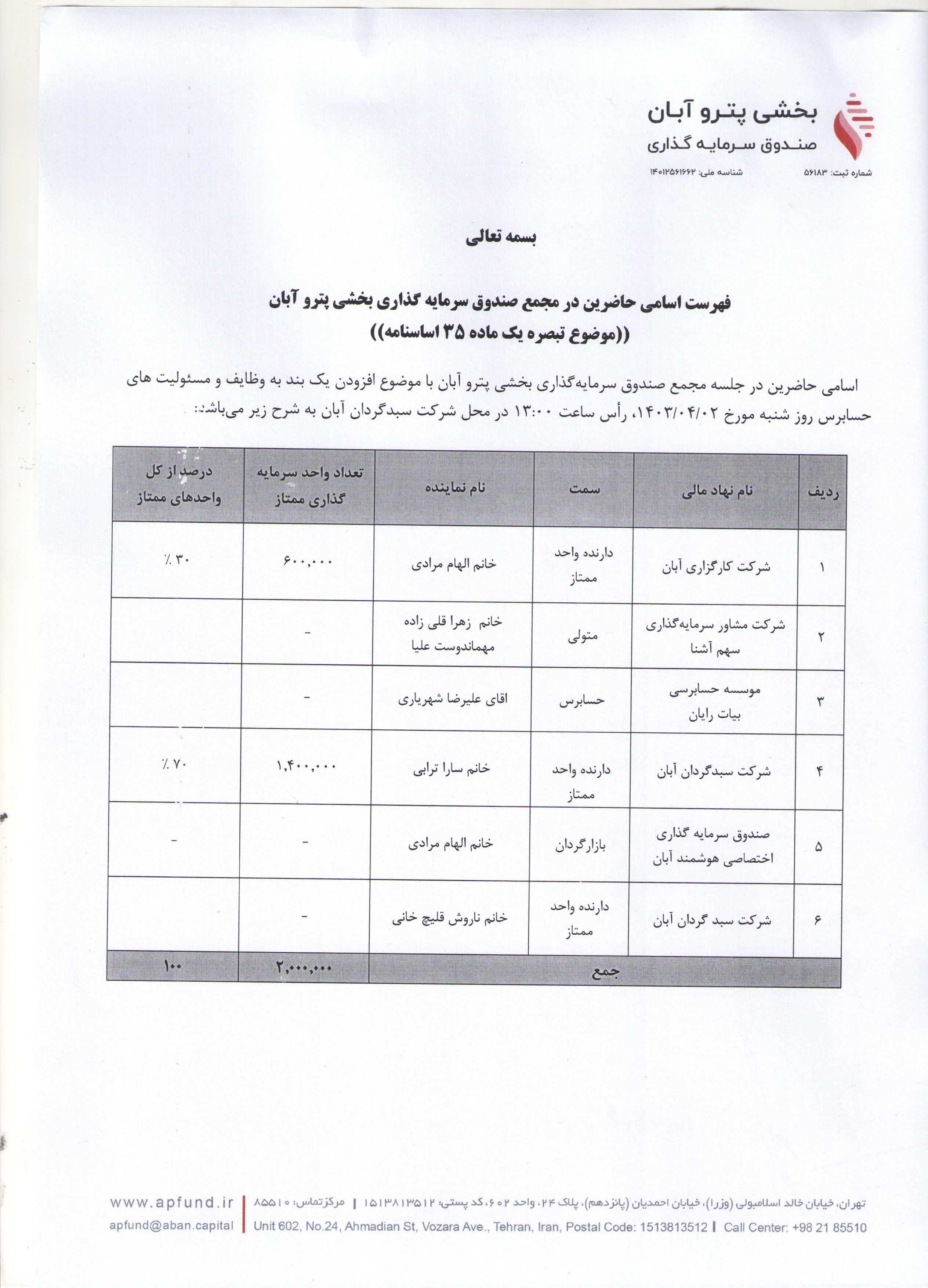 اسامی حاضرین در مجمع صندوق سرمایه گذاری بخشی پترو آبان با موضوع افزایش سقف واحدهای سرمایه گذاری و تغییر پارامترهای بازارگردانی مورخ ۱۴۰۳/۰۳/۰۸