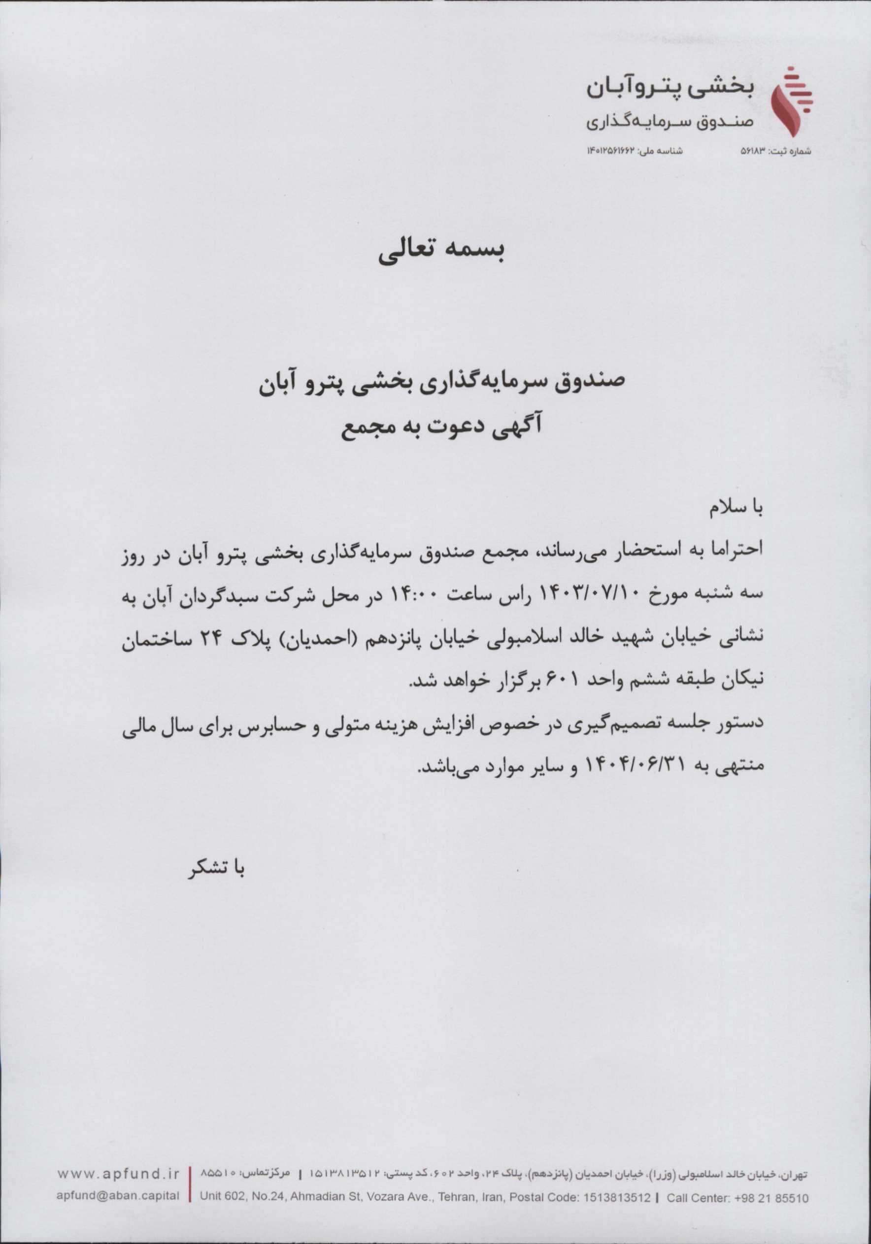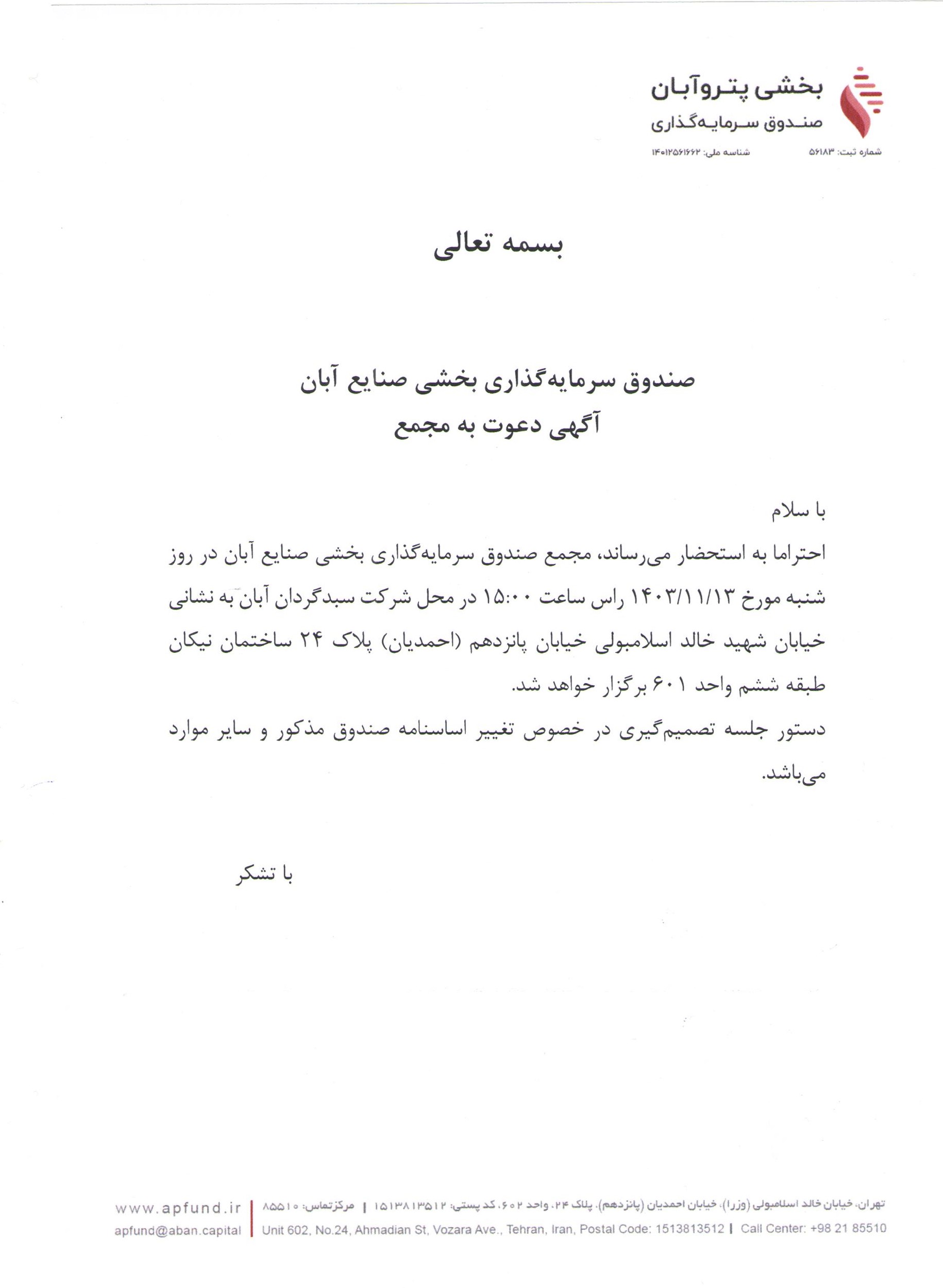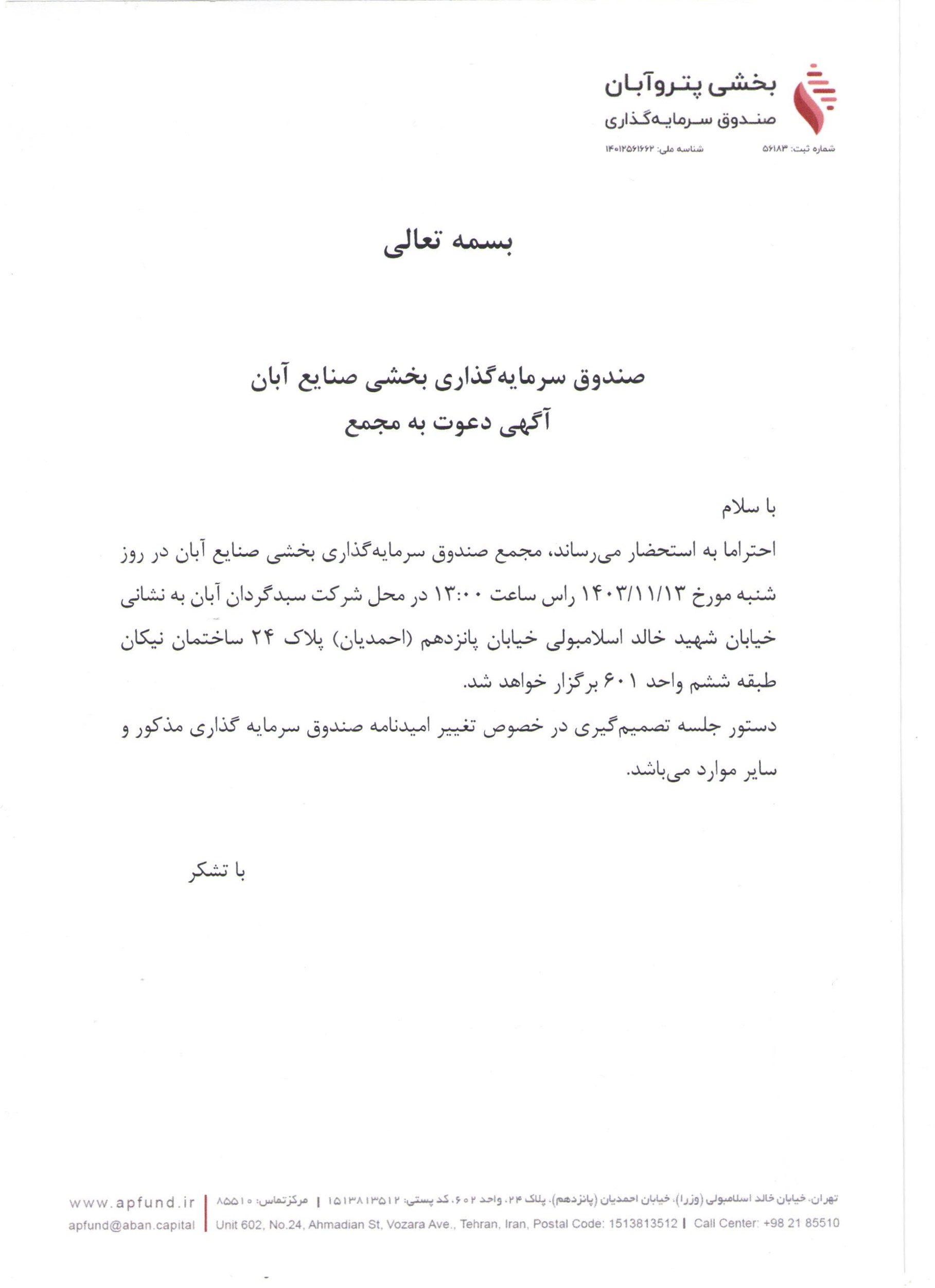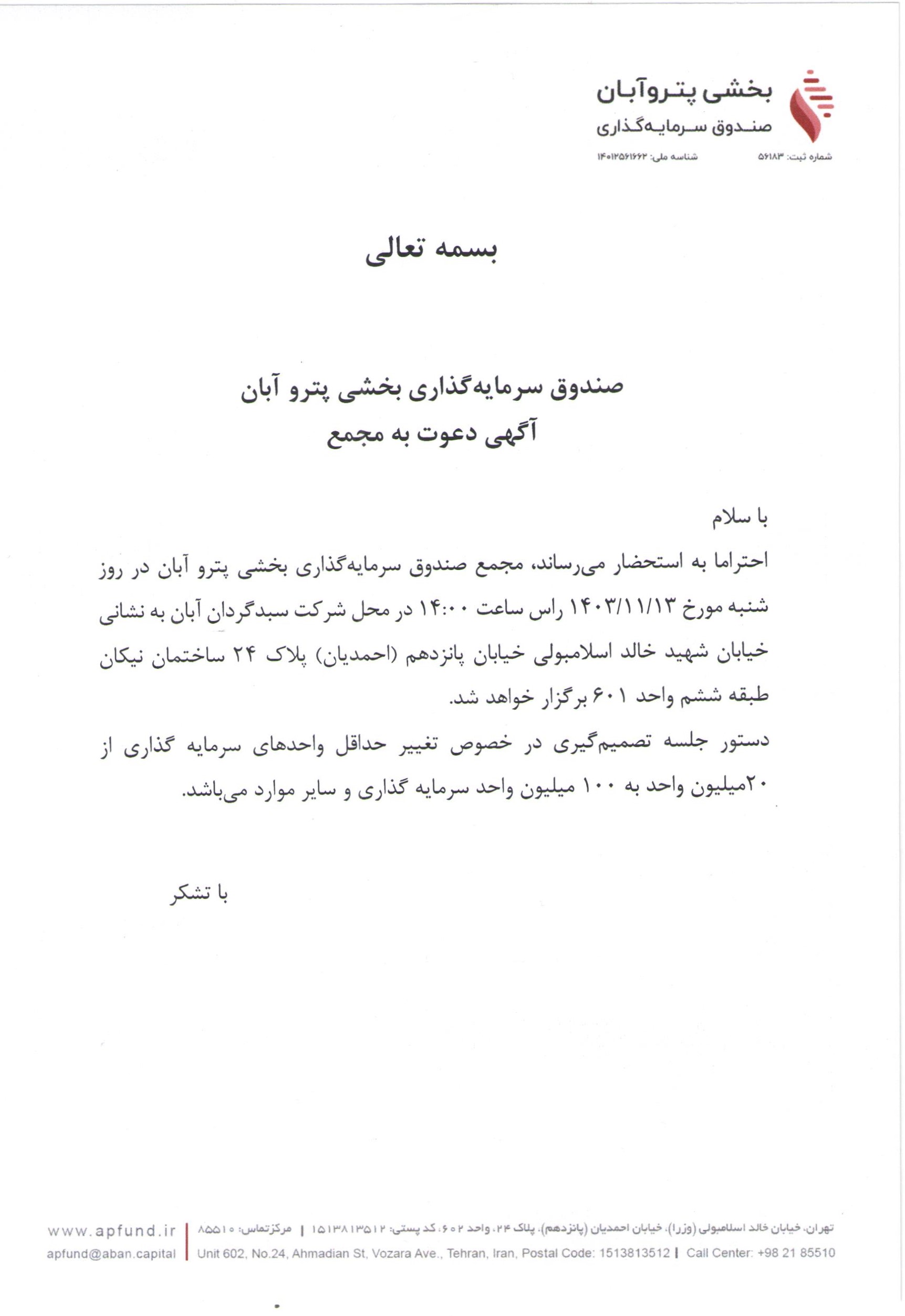 آگهی دعوت به مجمع صندوق سرمایه گذاری بخشی پترو آبان با موضوع تغییر حداقل واحدهای سرمایه گذاری از ۲۰ میلیون به ۱۰۰ میلیون واحد سرمایه گذاری مورخ ۱۴۰۳/۱۱/۱۳