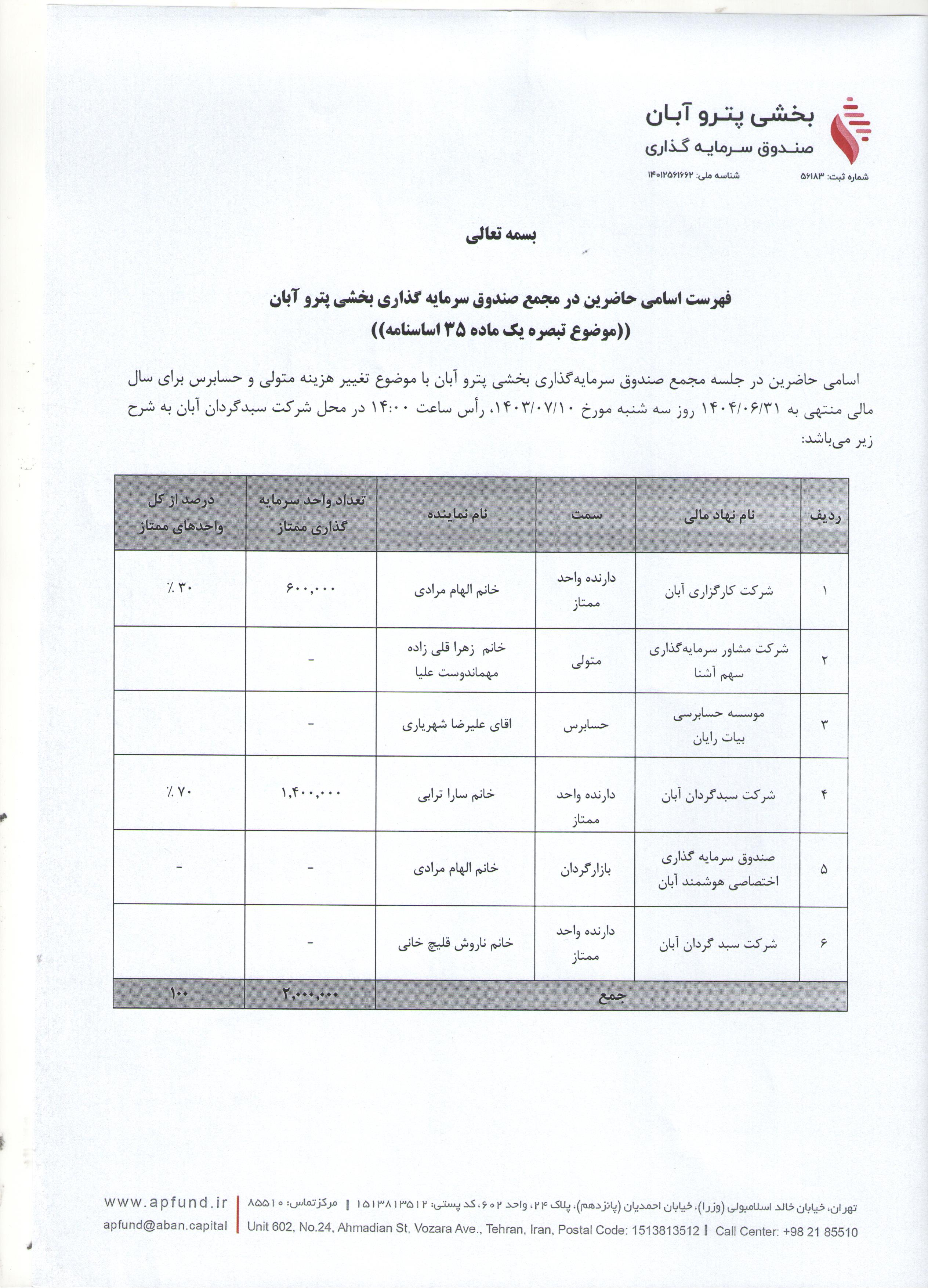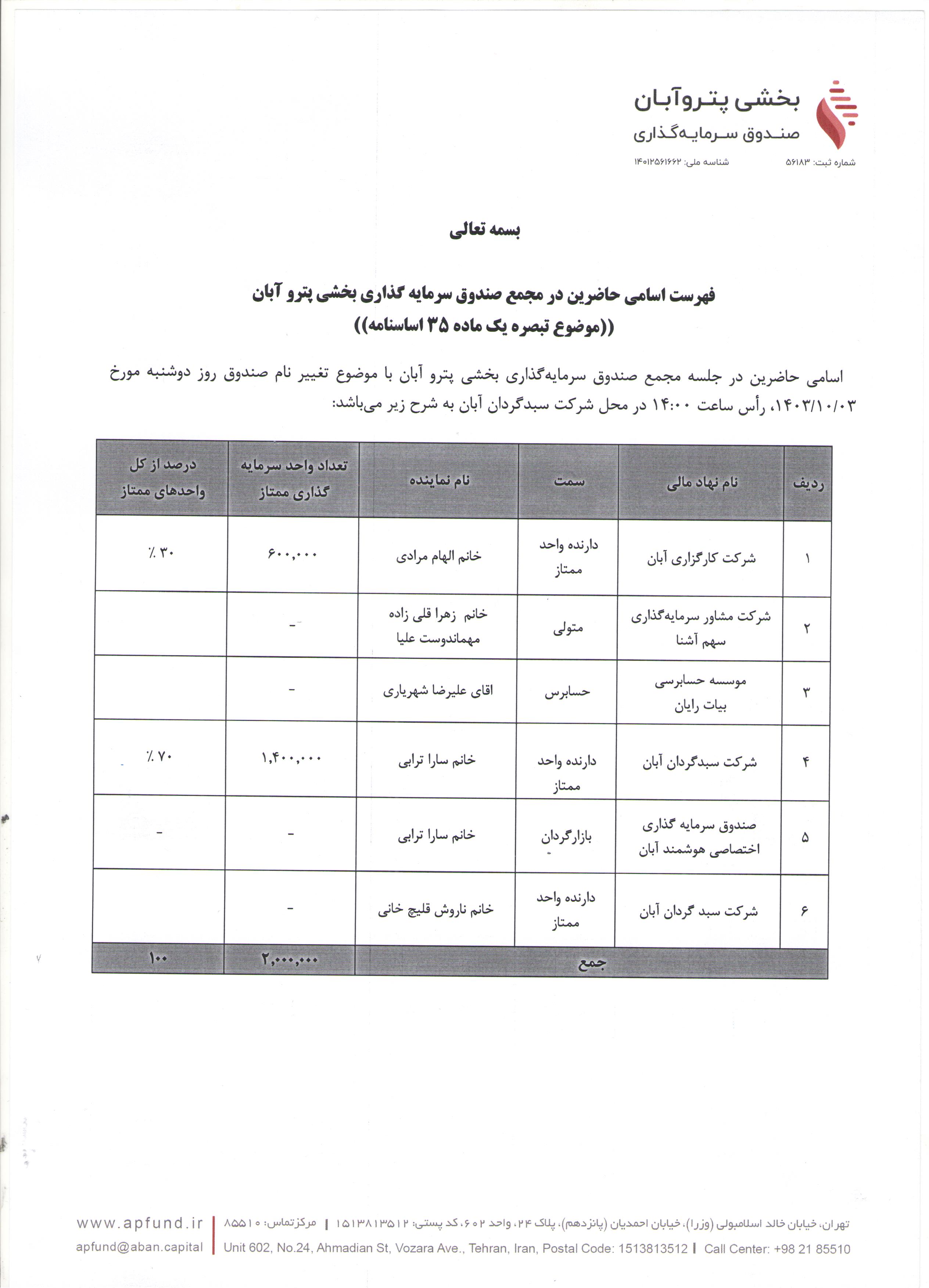 اسامی حاضرین در مجمع صندوق سرمایه گذاری بخشی پترو آبان با موضوع تغییر نام صندوق مذکور مورخ ۱۴۰۳/۱۰/۰۳