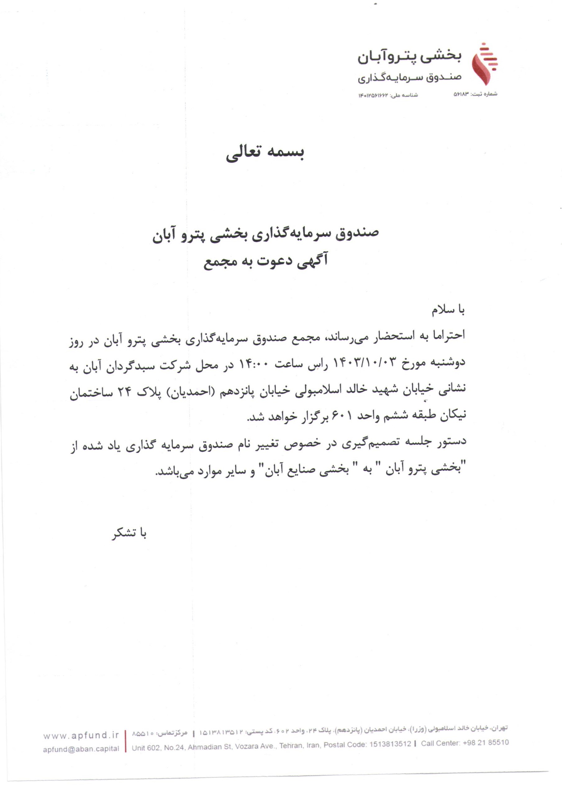 آگهی دعوت به مجمع صندوق سرمایه گذاری بخشی پترو آبان با موضوع تغییر نام صندوق مورخ ۱۴۰۳/۱۰/۰۳