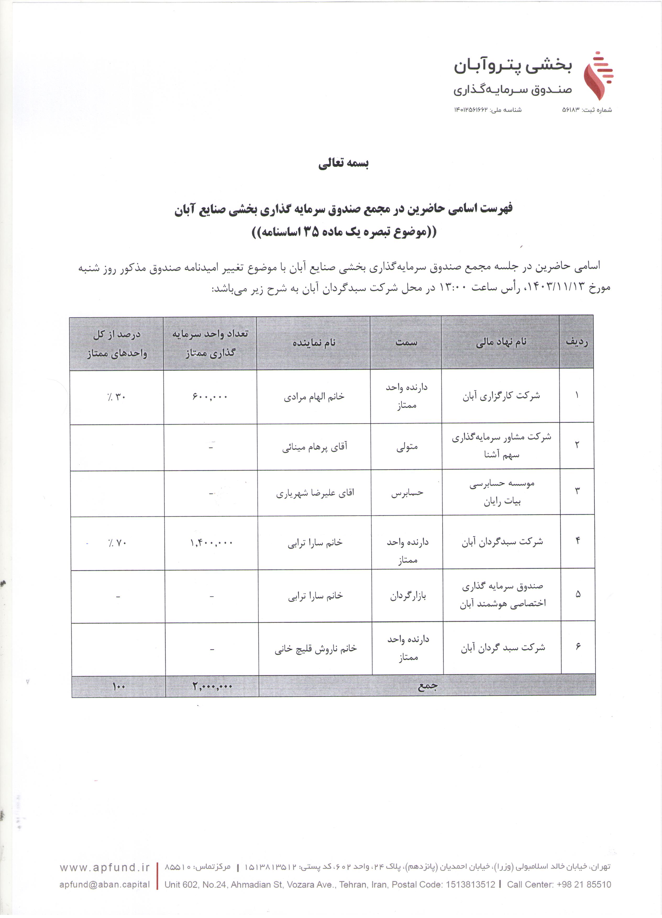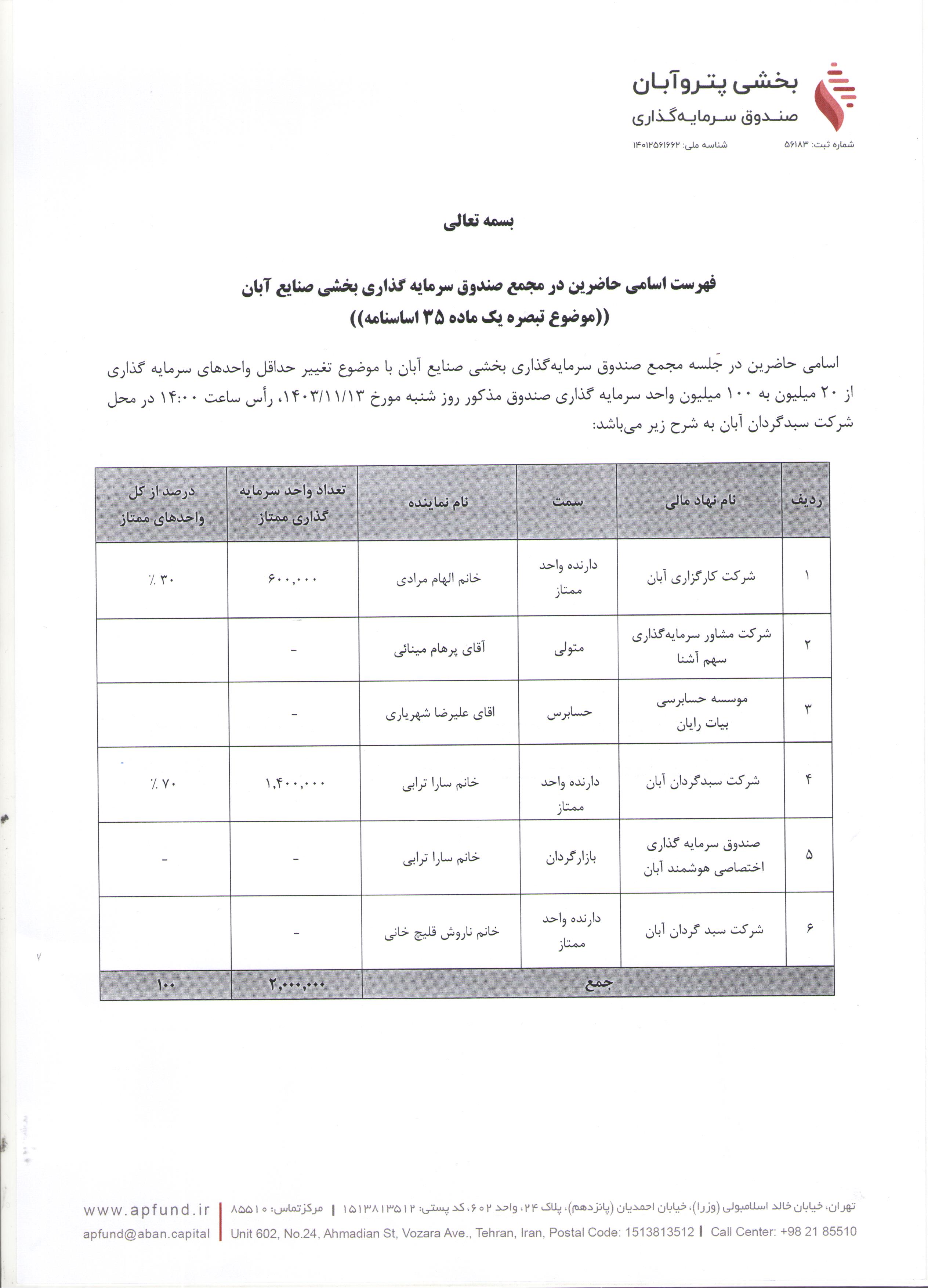 اسامی حاضرین در مجمع صندوق سرمایه گذاری بخشی صنایع آبان با موضوع تغییر حداقل واحدهای سرمایه گذاری از ۲۰ به ۱۰۰ میلیون واحد مورخ ۱۴۰۳/۱۱/۱۳ ساعت ۱۴:۰۰