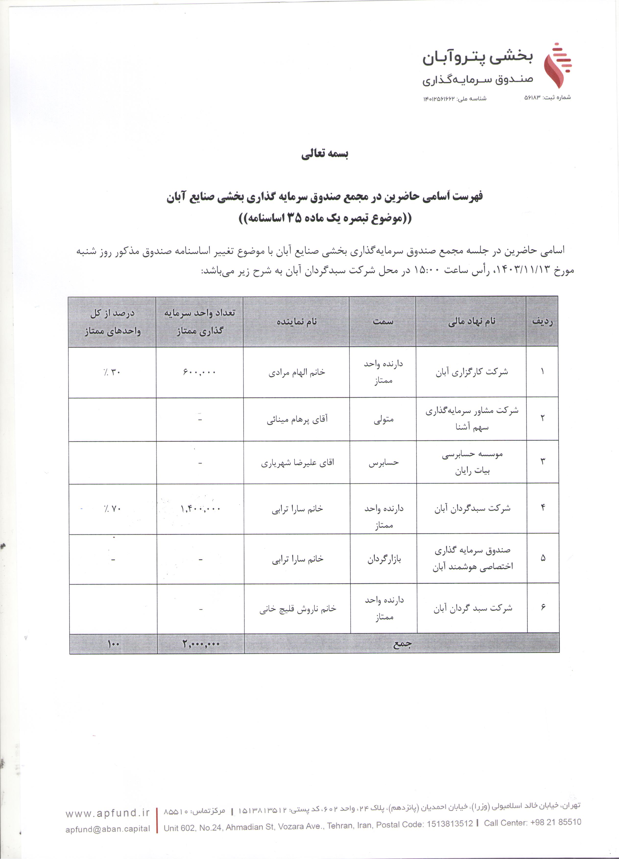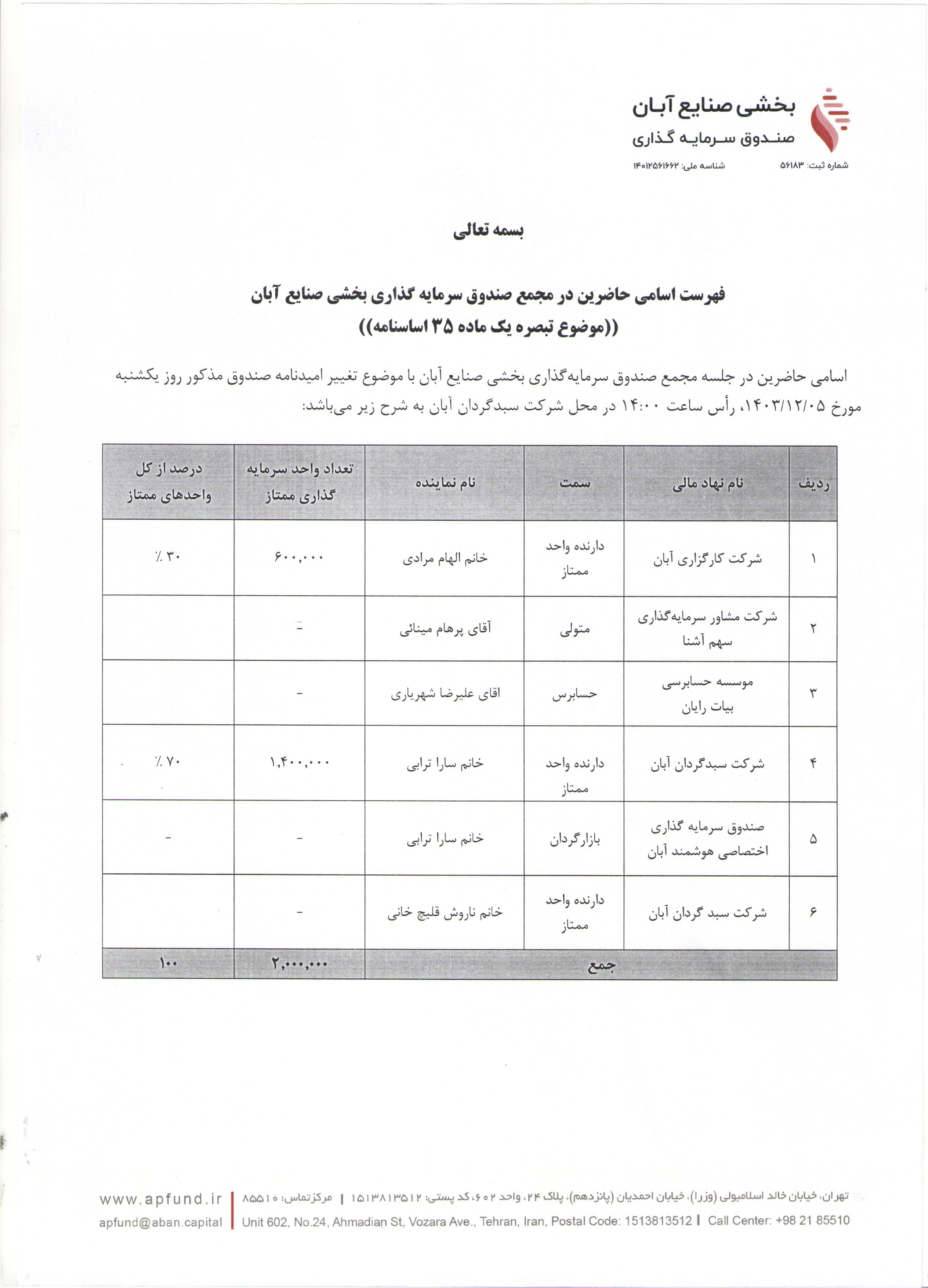 اسامی حاضرین در مجمع صندوق سرمایه گذاری بخشی صنایع آبان با موضوع تغییر اساسنامه صندوق مذکور مورخ ۱۴۰۳/۱۱/۱۳ ساعت ۱۵:۰۰