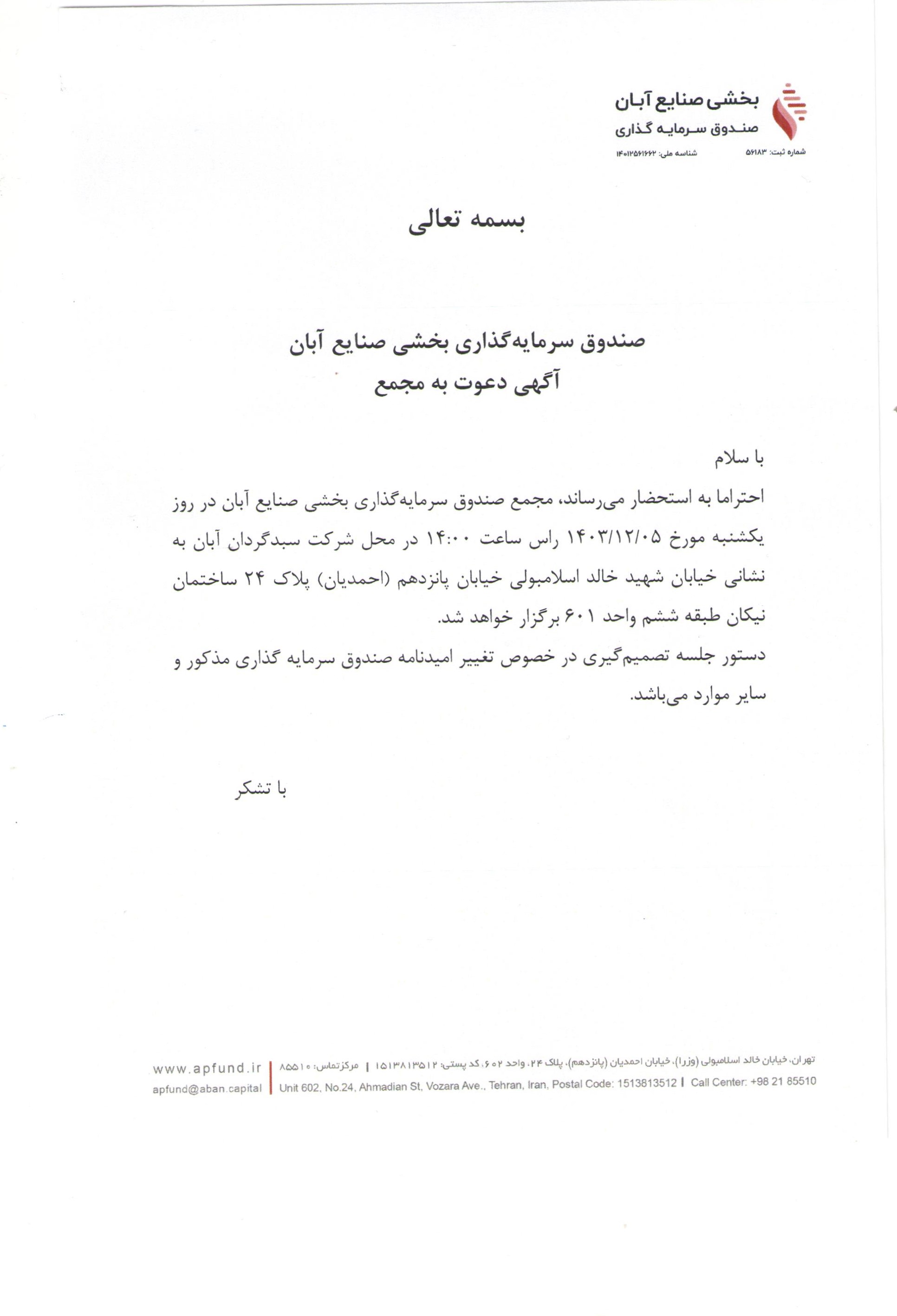 آگهی دعوت به مجمع صندوق سرمایه گذاری بخشی صنایع آبان با موضوع افزایش هزینه متولی و حسابرس منتهی به ۳۱ شهریور ۱۴۰۵ مورخ ۱۴۰۴/۰۶/۰۳ ساعت ۰۹:۰۰