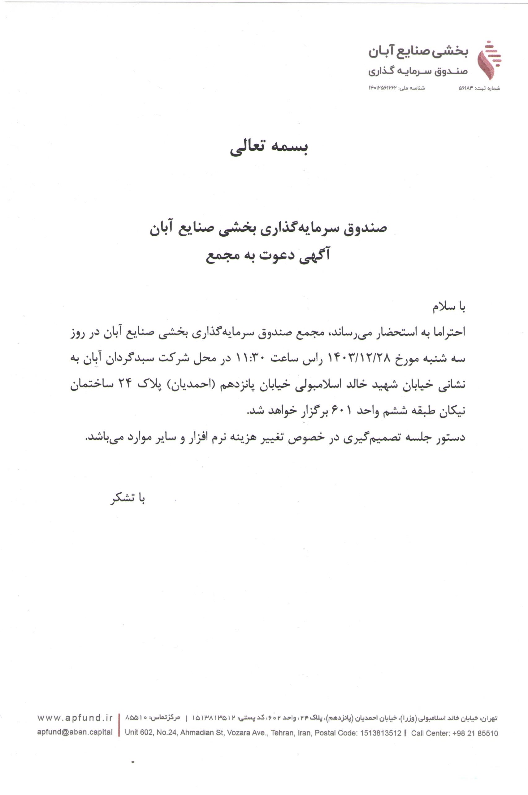 آگهی دعوت به مجمع صندوق سرمایه گذاری بخشی صنایع آبان با موضوع تغییر نرم افزار مورخ ۱۴۰۳/۱۲/۲۸
