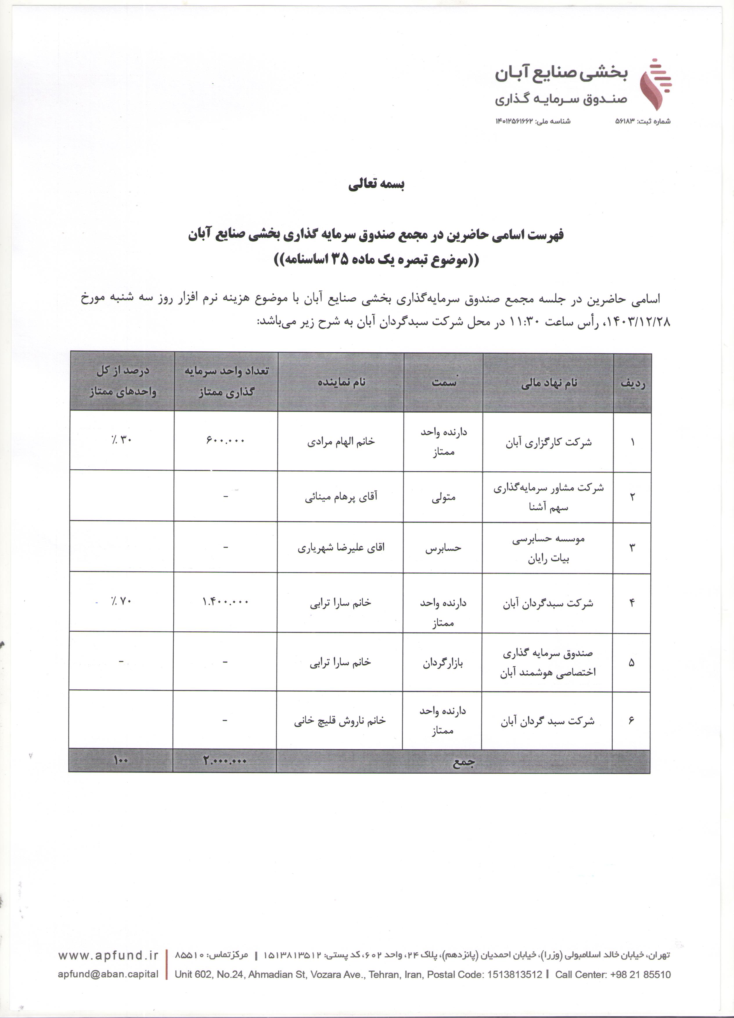 اسامی حاضرین در مجمع صندوق سرمایه گذاری بخشی صنایع آبان با موضوع تغییر هزینه نرم افزار مورخ ۱۴۰۳/۱۲/۲۸