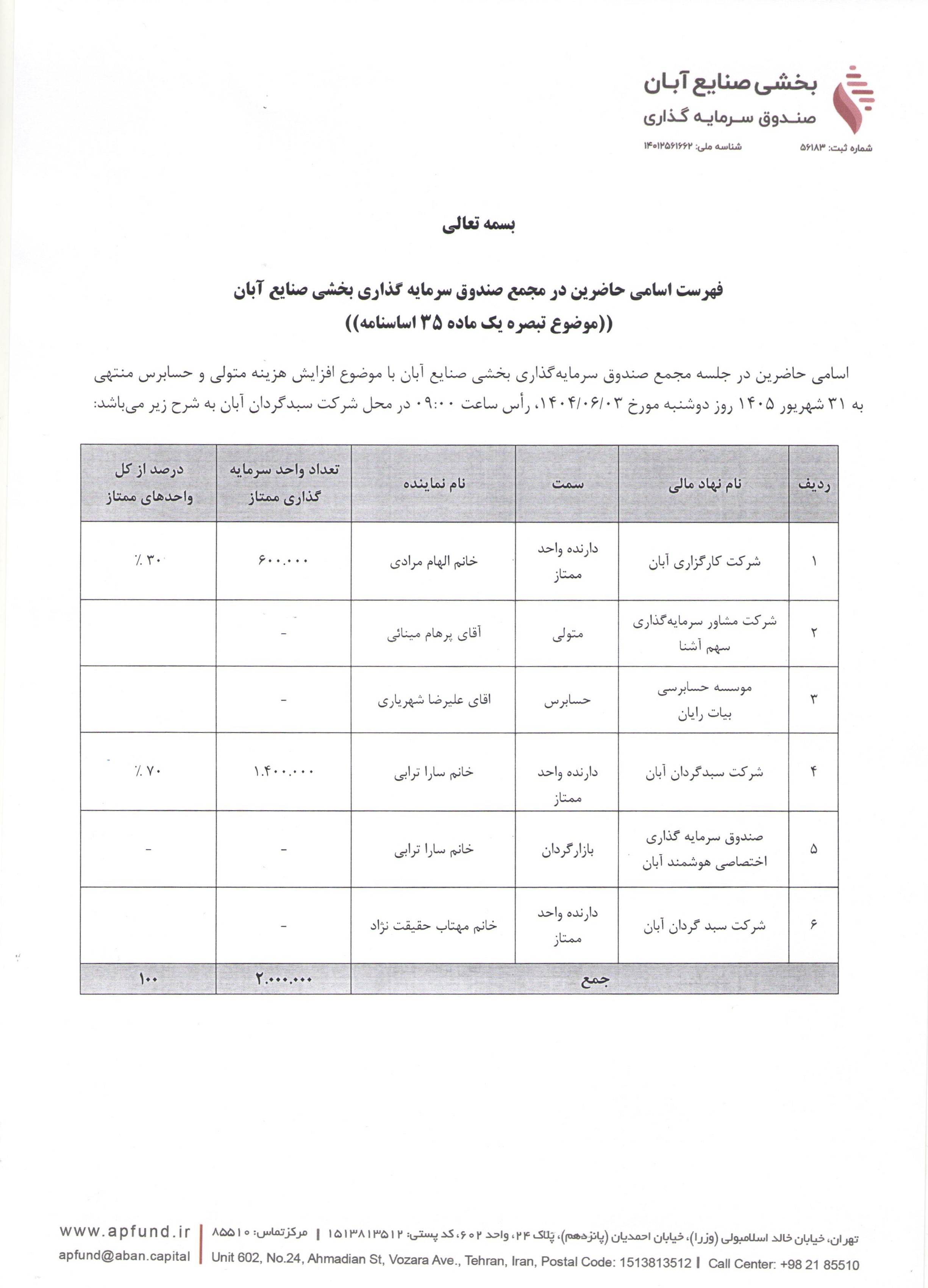 اسامی حاضرین در مجمع صندوق سرمایه گذاری بخشی صنایع آبان با موضوع افزایش هزینه متولی و حسابرس منتهی به ۳۱ شهریور ۱۴۰۵ مورخ ۱۴۰۴/۰۶/۰۳ ساعت ۰۹:۰۰