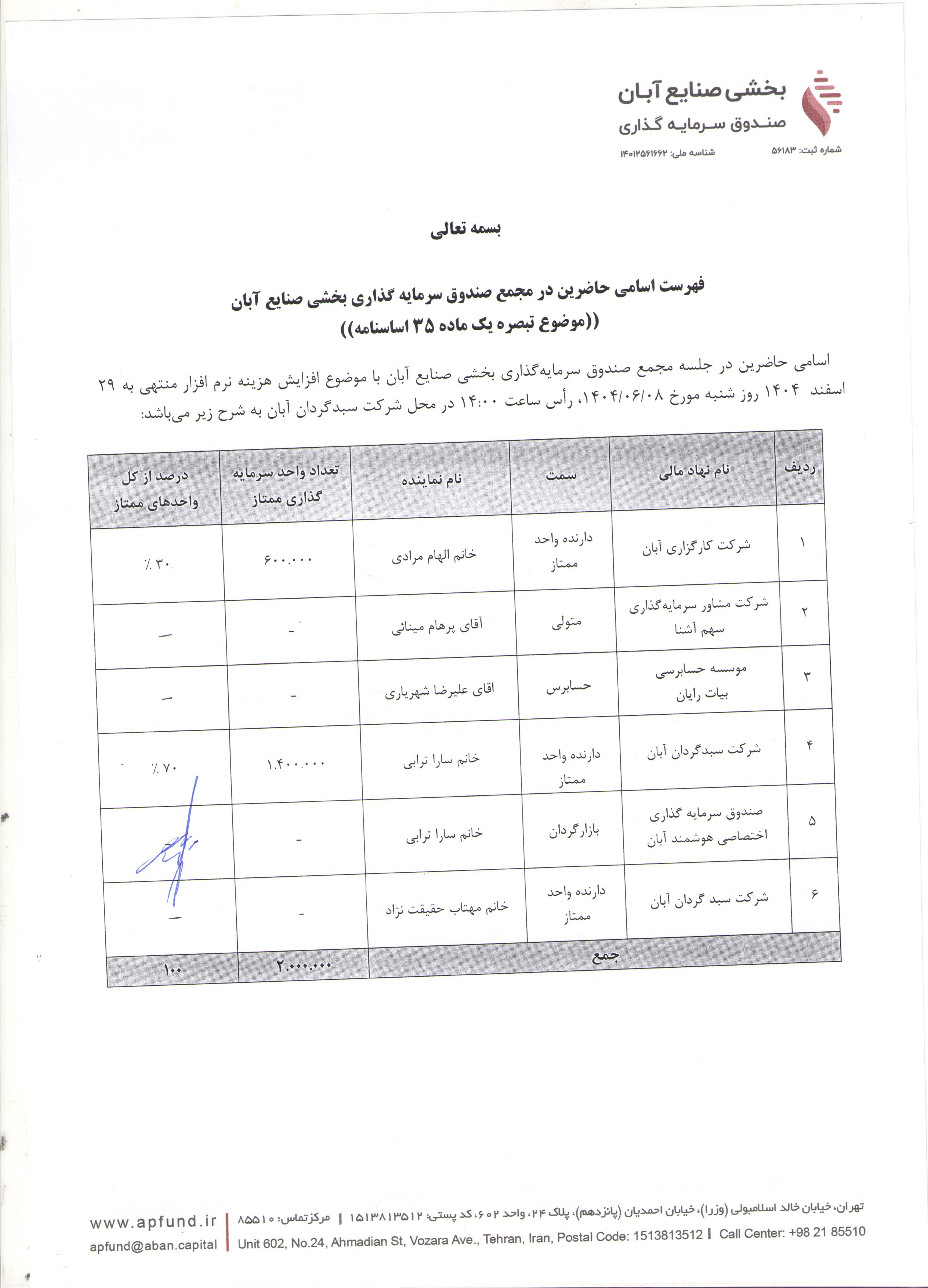 فهرست اسامی حاضرین در مجمع صندوق سرمایه گذاری بخشی صنایع آبان با موضوع تصویب صورت های مالی منتهی به ۳۱ شهریور ۱۴۰۴ مورخ ۱۴۰۴/۰۹/۱۶ ساعت ۱۰:۰۰
